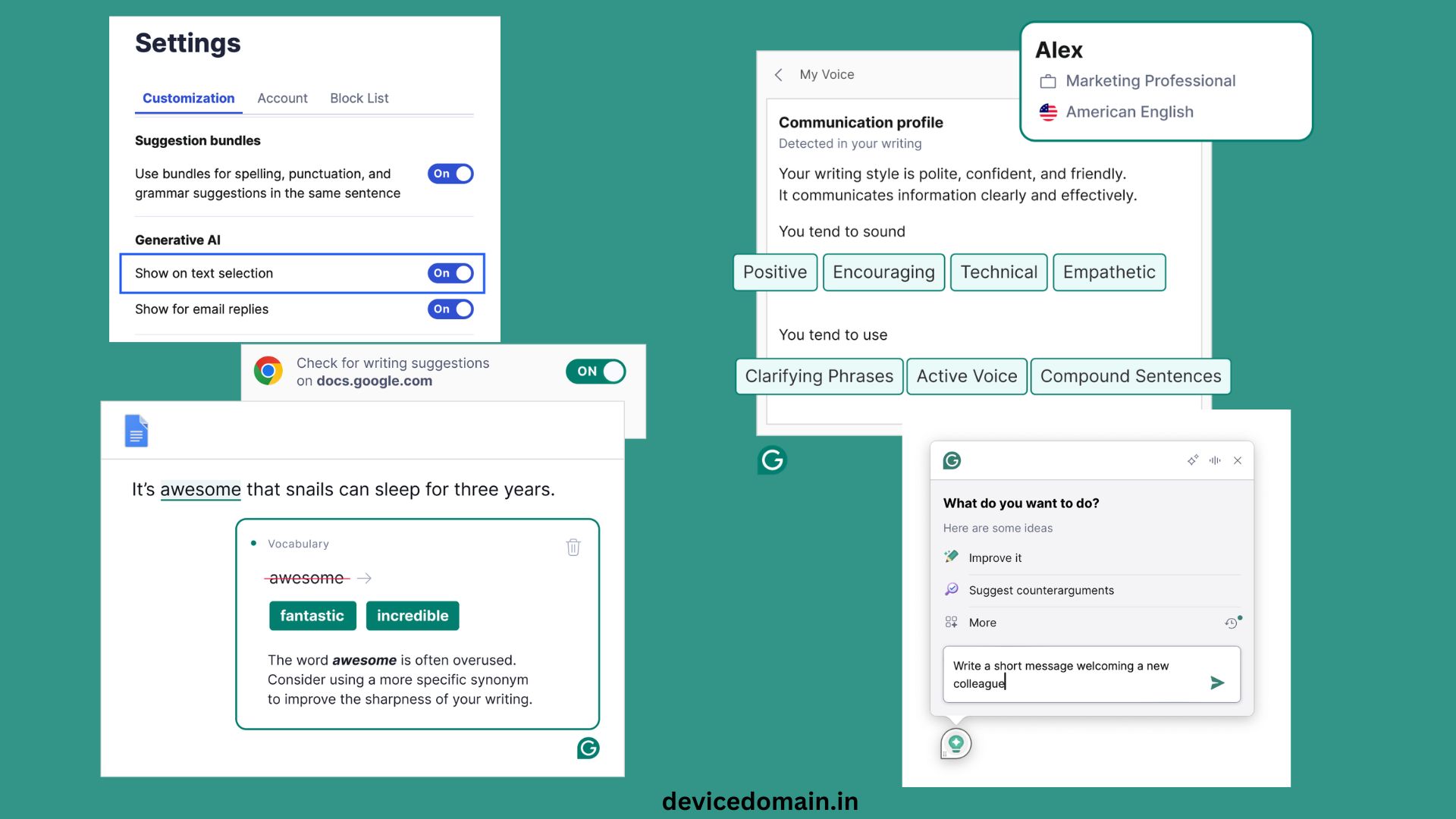 It checks grammar, spelling, and tone.
